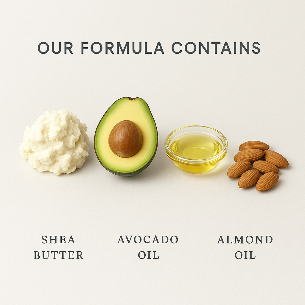 Shea Butter, Jojoba Oil, Coconut Oil, Amandel Oil, Avocado Oil, Candelilla Wax, Arrowroot Powder, Preservative Eco