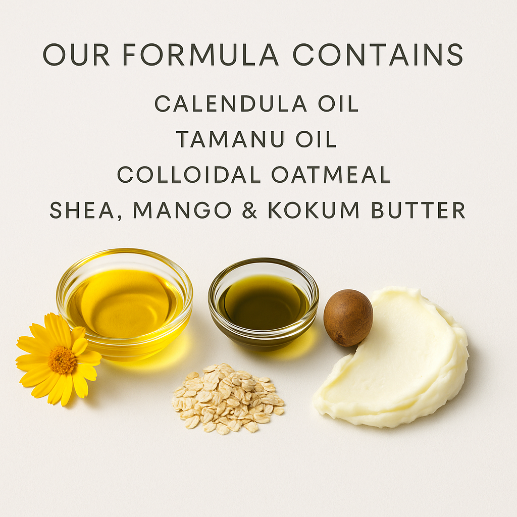 Calendula Oil, Tamanu Oil, Colloidal Oatmeal, Shea Mango butter, Kokum Butter Shea Butter