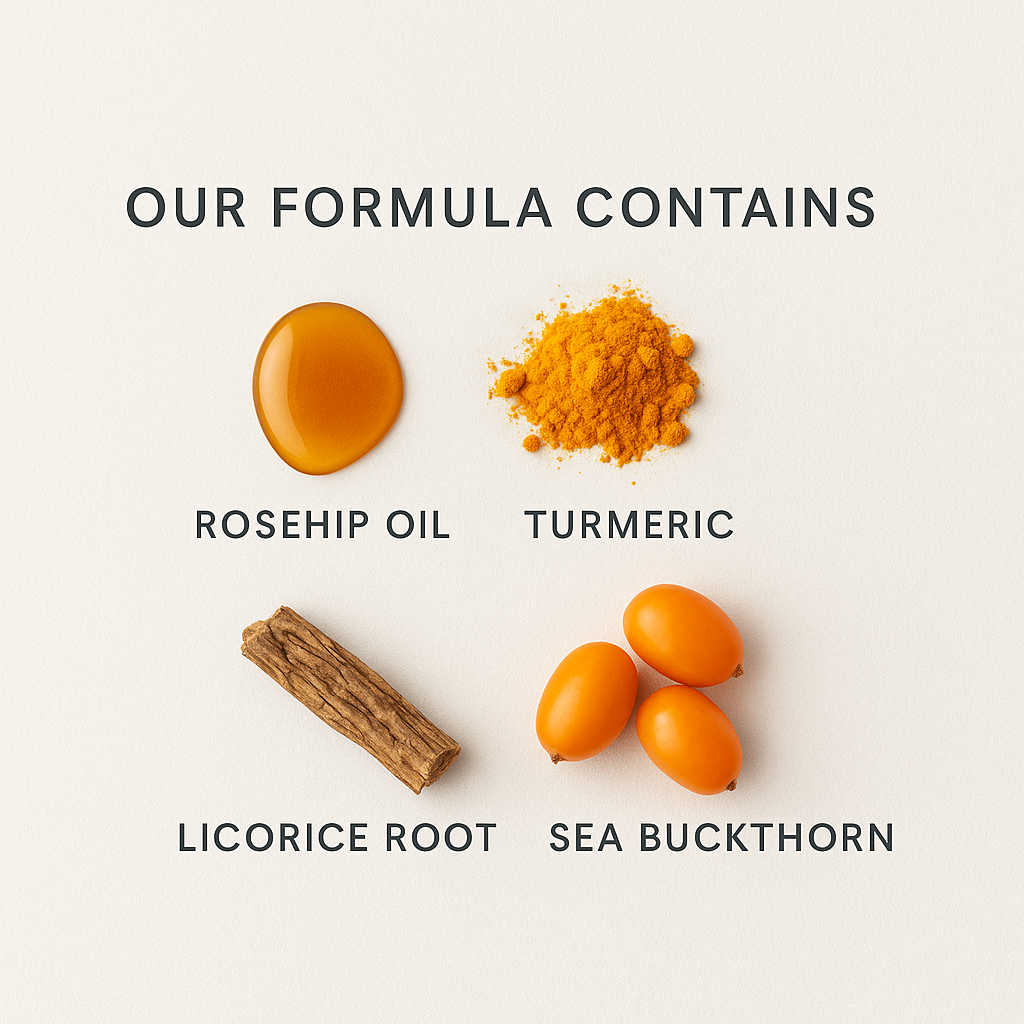 Infused with rosehip oil, turmeric, licorice root, and sea buckthorn